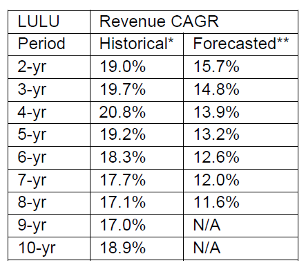*Calculated based on high end of guidance of current fiscal year (FY’22), excluding $275 mn revenue guidance for Mirror so that it’s more apple-to-apple historical comparison for the core Lulu brand. I wanted to use FY’22 since FY’21 is marred by pandemic which hides the true and underlying growth of Lulu