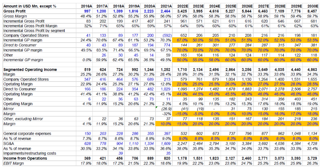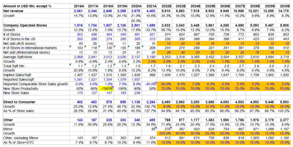 Lulu guided 150-200 bps gross margin expansion over 2020 despite 50 bps negative impact of freight costs in current year. I have not assumed any significant SG&A leverage in out years. For example, store operating margin in 2030 is modeled at 28.5%; Lulu’s stores posted 27.6% operating margin before the pandemic. In DTC, its 2030 operating margin is assumed to be 46% while it posted 45.1% operating margin last year.