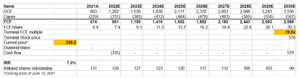 As you can see below, I needed to use 19x FCF multiple in 2030 to generate ~7% IRR. I believe Lulu’s operating performance can surprise to the upside compared to what has been modeled here AND the terminal multiple itself can potentially prove to be conservative. At 25-30x terminal multiple, shareholders will generate ~11-13% IRR (ceteris paribus). If Lulu can post better operating performance, it can potentially be mid-teen IRR investment from current prices.