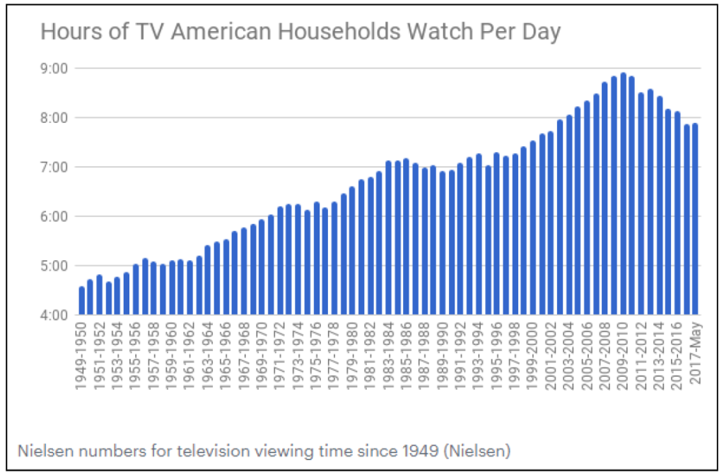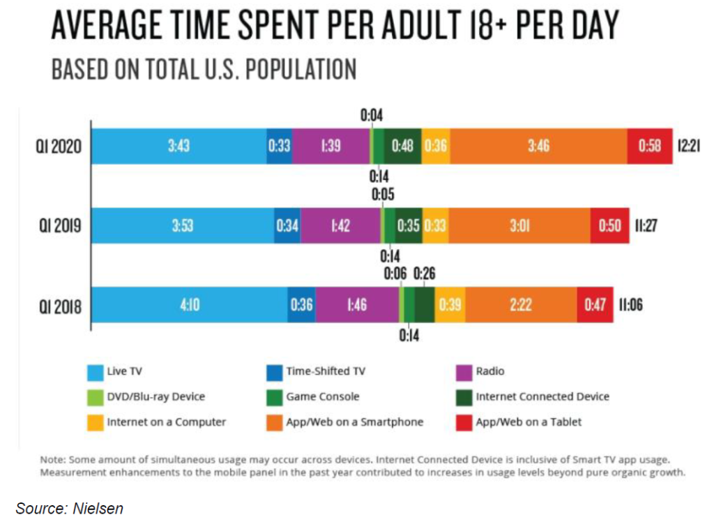 I do have a few concerns about TV watching hours and how sustainable it is in the long run. As you can see above, TV watching hours peaked in late 2000s, and gradually declined in the last decade. This time has mostly shifted to smartphone and apps as shown below. I think it’s fair to say all of our smartphones are going to be even more interesting in 5-10 years than it is today and hence smartphones/apps may continue to take time share from TV. Moreover, VR/AR or any other new visual platform may just completely bypass the TV platform and time share of TV can go down even further. SVODs are less susceptible to small changes in engagement since as long as Netflix can produce “Stranger Things” or HBO can produce “Game of Thrones” every few months, I am not going to unsubscribe. SVODs really get paid for superior content, not for streaming hours. However, for an AVOD, they need to convince us every day, in fact every minute, that we should spend our time watching their content. While I do think we will continue to watch Sports and AVOD content for years to come, I have a hard time believing that it will be 7-8 hours of household hours per day 5-10 years from now.