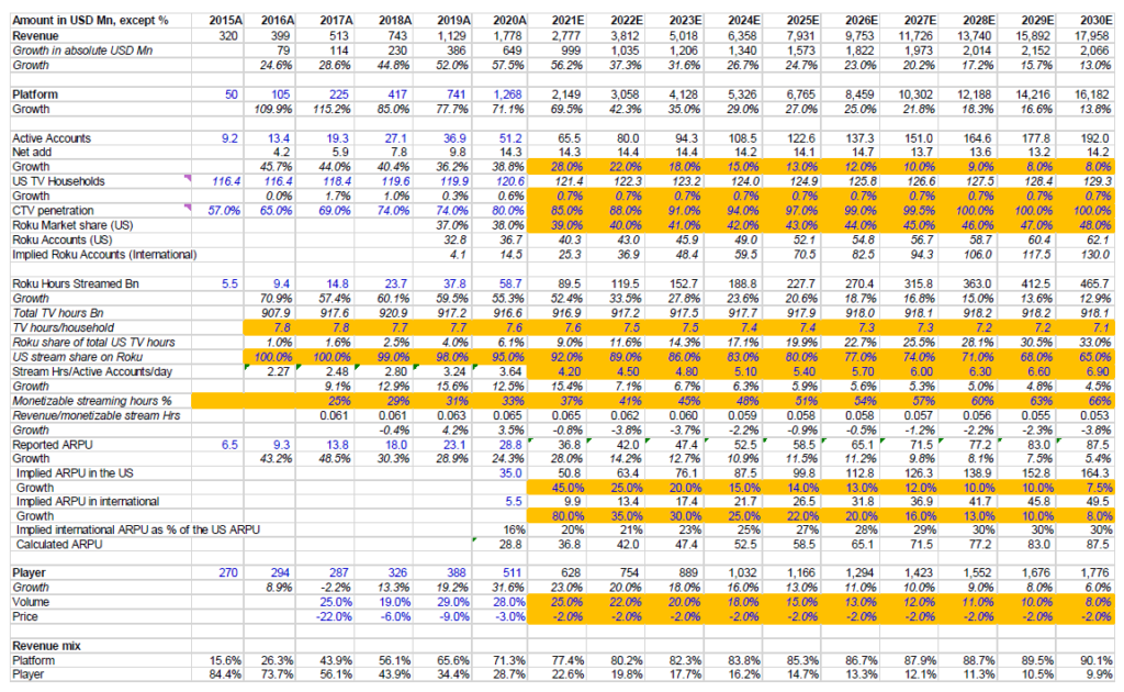 I have looked at Facebook’s ARPU in 2020 which was $164 in North America and EMEA ARPU was $51 or 31.1% of North America ARPU. It is very hard to predict ARPU with any precision and frankly, I am not sure whether this is conservative or aggressive. Bears may argue Facebook has the best ad platform in the planet and anchoring ARPU based on FB may prove to be too aggressive. On the other hand, bulls may argue Roku’s platform revenue does not only consist of ads, but also non-ad revenues as discussed before (I think by 2030, it will be ~90% ads for platform), and Roku’s ad targeting capabilities in the CTV world is a step function change compared to the linear world, so if anything, 10 years may prove to be too long a time for Roku to match Facebook’s ARPU. Although I struggle to pick a side on this point as I see some merit on both cases, it is a number I will closely follow to evaluate the stock going forward.