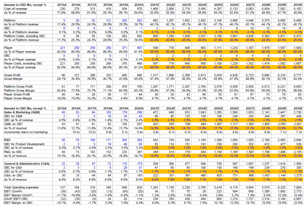 Cost structure: I have incorporated some scale benefits for S&M, R&D, and G&A expenses, but the real debate/question is related to Roku’s Gross Margin. For player segment, I just assumed 95% cost of revenue (excluding SBC) in each of the next 10 years. I won’t be surprised if gross margin is even thinner than modeled here, but given the declining contribution of player revenue, it is not consequential.