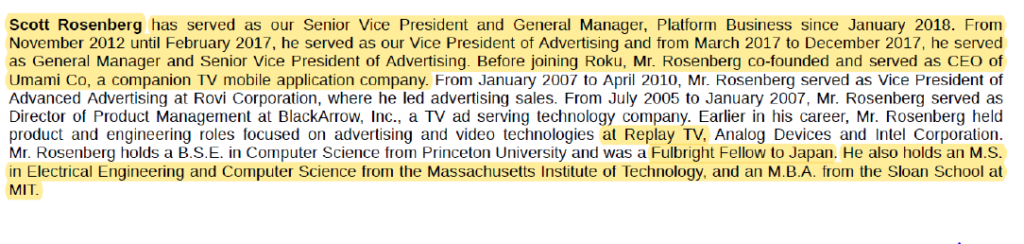 In case Roku remains an independent company in the long-term, it is perhaps highly likely Wood may not be at the helm in 2030 (perhaps not even 2025?). I have asked some investors/analysts who they think potential successors can be. Two names came up: Steve Louden (current CFO) and Scott Rosenberg (currently runs Platform Business). I consider Louden to be a very unlikely candidate. Roku is simply way too early in its journey to be led by a CFO and being a company that juxtaposes two very dynamic industries (tech and media), I would give Rosenberg a much better odd to succeed Wood. Louden has been CFO since 2015, but Rosenberg’s history with Roku/Wood goes way back to the “Replay TV” days. Roku is through-and-through an ad business and if Wood ever retires, I think shareholders will feel more comfortable if it’s led by someone who has been running the ad business for almost last 10 years. Rosenberg’s profile is mentioned below: