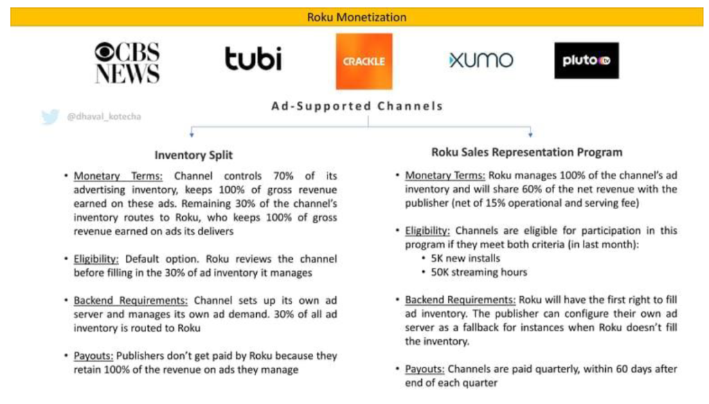 How does Roku monetize this? Dhaval Kotecha, who works at Programmatic AdTech industry, recently explained Roku’s AVOD monetization in an illustrative tweet (shown below).