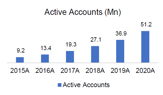 Number of Accounts: This particular KPI tracks the scale of Roku’s platform. Since monetization of a user only begins when he/she has the Roku stick or Roku branded TV, Roku is, first and foremost, focused in growing the scale of its platform. They were willing to drive down gross margin by ~1,000 bps to grow active accounts at 41% CAGR over the last five years.