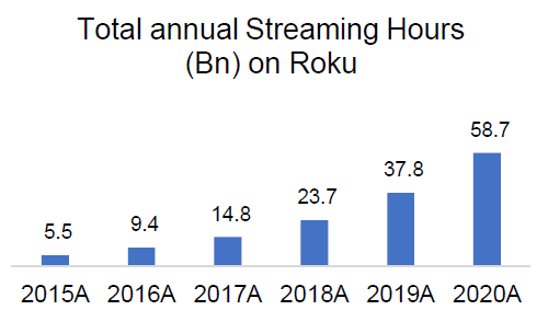 The TAM for TV advertising is $173 Bn, of which $70.6 Bn is in the US. As the gatekeeper of OTT content, Roku is in an enviable position to capitalize on this big market as TV watching hours shift from linear to OTT. Roku’s recent acquisitions such as dataxu in 2019 which is a Demand Side Platform (DSP), and Nielsen’s Advanced Video Ad business in March 2021 clearly indicate Roku’s broader ambition in the ad business.