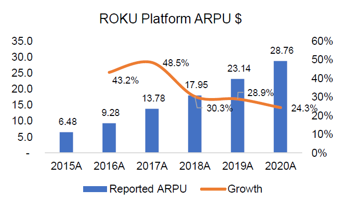 ARPU: If customers buy the stick/TV and watch engaging content on Roku’s OS, the final KPI corresponds to how well Roku is being able to monetize this engagement. ARPU is basically the total platform revenue divided by the average number of users in a period. The trove of data Roku’s platform has on consumers helped them increase ARPU at 34.7% CAGR over the last five years. ARPU is a testament to the effectiveness of Roku’s monetization methods and it is apparent that once active accounts scale and consumers engage by streaming content, Roku knows how to monetize such engagement in a very effective manner.