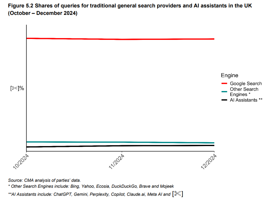 Google still accounts for around a 90% share of queries to traditional general search providers and AI assistants combined in the UK. In December 2024 the volume of AI assistant queries was about 0-5% of the volume of Google’s general search queries, albeit that use of AI assistants has been growing quickly with query volume on AI assistants growing by 20-30% in the last three months of 2024. Amongst AI assistants, we estimate that ChatGPT receives by far the greatest volume of queries in the UK, accounting for 80-90% of UK queries to AI assistants in December 2024. In contrast, Google’s Gemini AI assistant only accounted for 0-10% of queries to AI assistants.