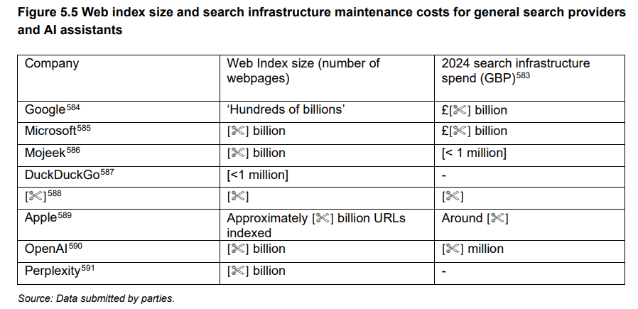 Bing is the only English-language provider to have developed search infrastructure which is comparable to Google’s. As shown in the table below, all third parties, both traditional general search providers and AI assistants, which have developed their own search infrastructures have a web-index which is a fraction the size of Google’s and Bing’s and which costs a fraction of the sum spent by Google and Microsoft to maintain."