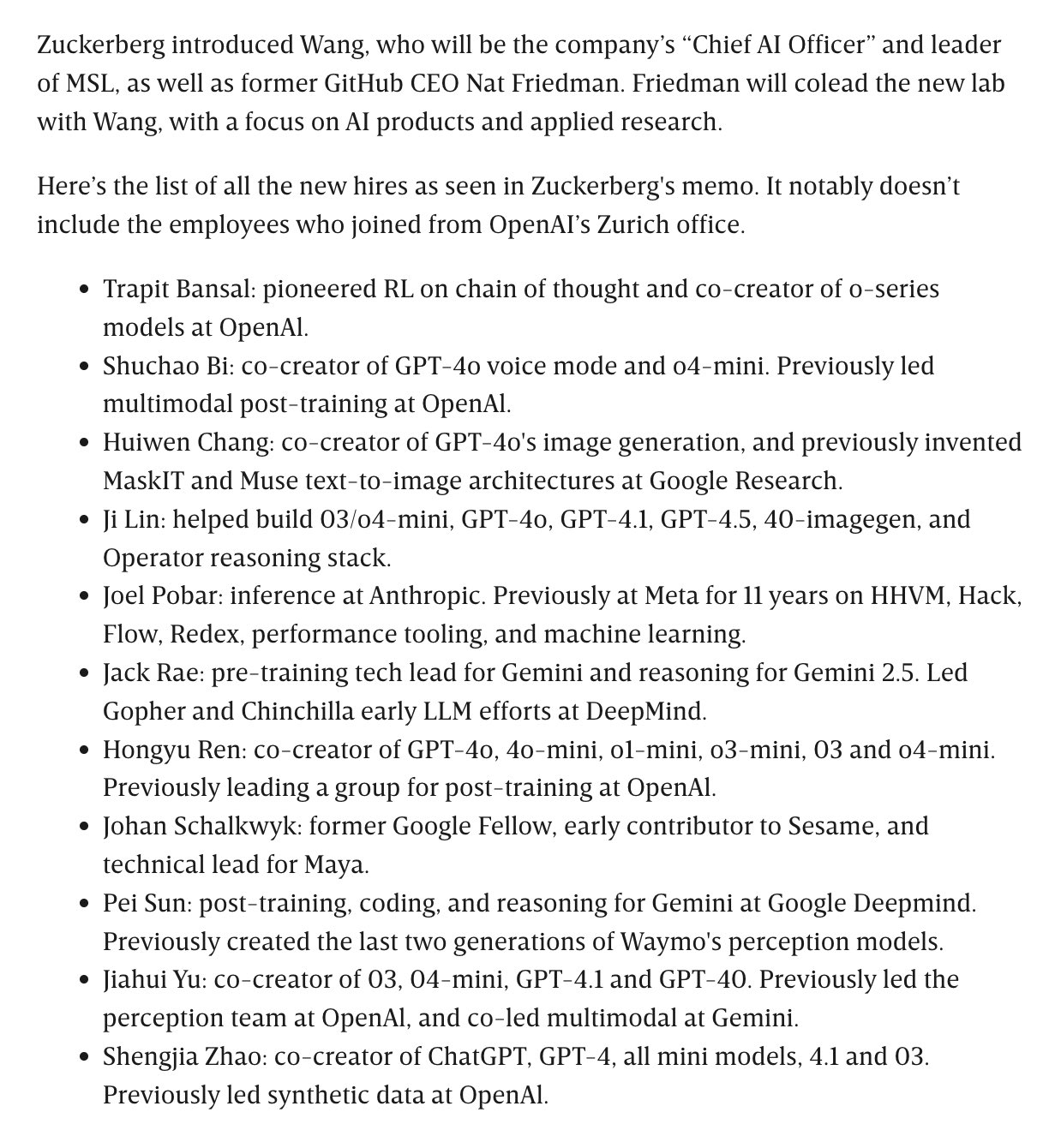 From WIRED, Everyone Meta hired in their "Superintelligence" team so far: