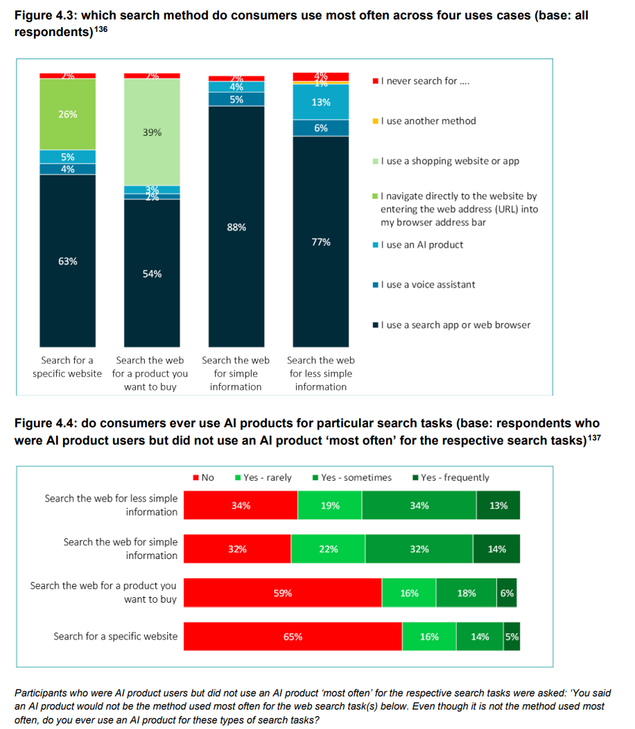 "The research also found that all consumers reported still using traditional search engines alongside AI assistants. In other words, traditional search engines and AI assistants are perceived as complementary rather than fully substitutable. For example, although consumers do sometimes use AI assistants for ‘search-like’ tasks, they may resort to traditional general search engines to confirm that the output they receive is reliable, and/or carry out a ‘follow-up’ search task such as navigating to a website