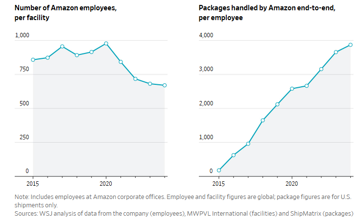 The average number of employees Amazon had per facility last year, roughly 670, was the lowest recorded in the past 16 years, according to a Wall Street Journal analysis, which compared the company’s reported workforce with estimates of its facility count.