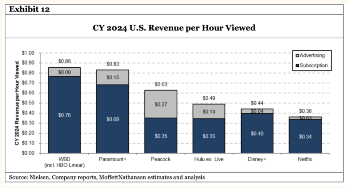 While on my walk yesterday, I was thinking about Eric Seufert's podcast that I mentioned in the last Daily Dose and I was making a connection with an earlier post by Ben Thompson. Ben posted about this chart below (originally by MoffettNathanson) in early 2025 and quoted MoffettNathanson to make a striking point: "The average Paramount+ subscriber is paying double in subscription fees for each hour of viewing pleasure compared to the average Netflix subscriber in the U.S."