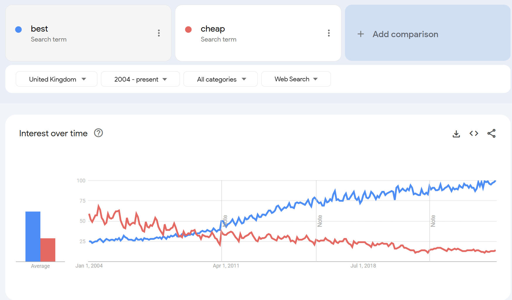 “So in 2004, you go on the internet and you already know what you want and you look for the cheap- what is the cheap X and then you put in a scoop or you put in a product or something. Whereas over time that goes down and best goes up and best goes up and crosses it. It's a perfect X on the chart, and the thesis is you're going further up the funnel. You're looking more and more for I want someone on the internet to tell me the best X or Y where previously you'd have got that from the magazine or newspaper or something.”