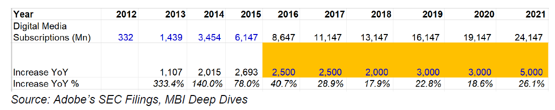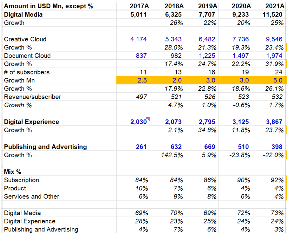 Adobe reports Digital Media in two categories: Creative Cloud (CC), and Document Cloud (DC). Adobe used to disclose subscriber numbers for Digital Media segment until 2015. However, since Adobe kept its prices fixed after moving to subscription model until 2018, we can make some educated assumptions (which I’ll discuss later) to estimate that Digital Media’s subscribers increased by almost four-fold in the last 6 years i.e. ~6 mn in 2015 to ~24 mn in 2021.