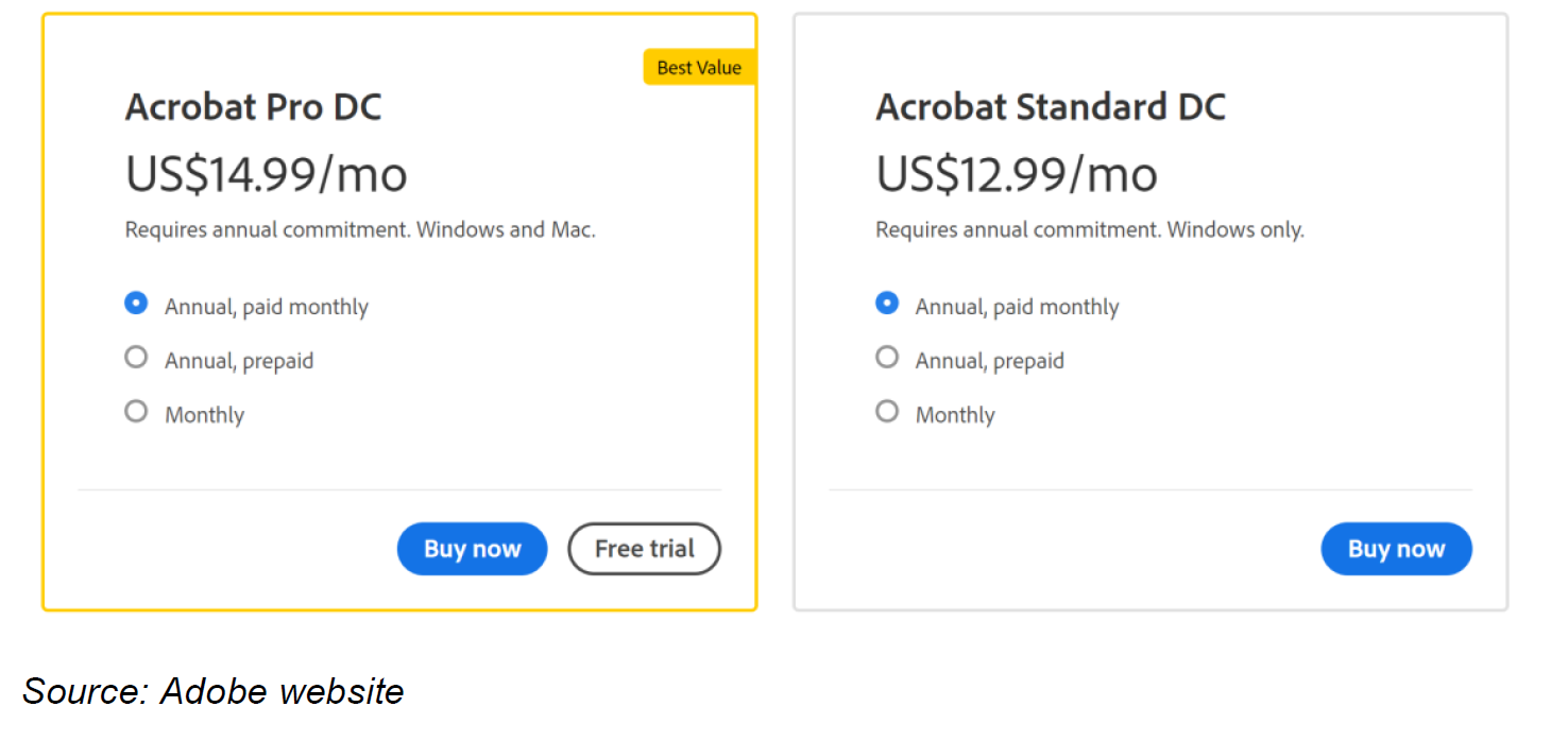 Document Cloud: Document Cloud business consists of Acrobat branded products which allow you to create, edit, export, combine, share, and collaborate on PDF documents. If you buy the whole Creative Cloud subscription, it already includes Acrobat Pro subscription, but you can also buy just Acrobat subscription for $14.99/month (individual pricing; different pricing available for businesses and students). Adobe Sign, which allows users to send and sign any document from any device, and Adobe Scan are also included in the Document Cloud segment. Unlike Creative Cloud, you cannot choose a la carte in Document Cloud, and everything is bundled together in Acrobat Pro/Standard subscription.
