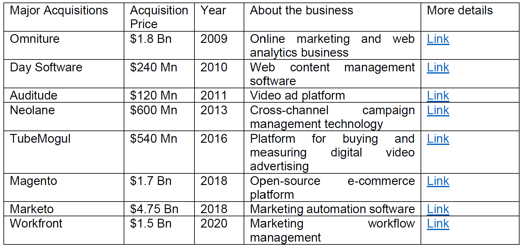 Digital Experience/Experience Cloud: With its Omniture acquisition back in 2009 for $1.8 Bn, Adobe first showed real intent in building Digital Experience business, which was formerly known as “Digital Marketing” segment. Adobe explained the thinking behind building this business: