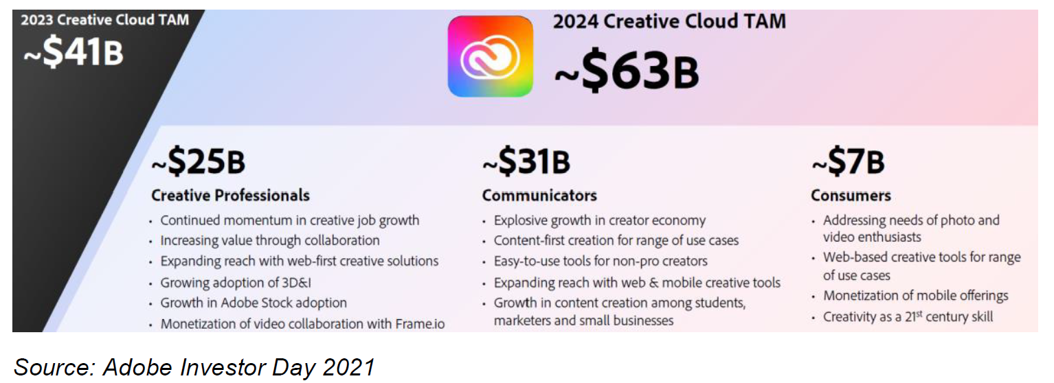 In 2021 Analyst meeting, Adobe significantly expanded its TAM from $7.5 Bn in 2021 to $13 Bn in 2022, $21 Bn in 2023, and $32 Bn in 2024. It is likely that Adobe’s TAM numbers has become too aggressive and hence less meaningful compared to the estimates it shared before. Given the investors’ generosity to massive TAM and narrative premium in the last couple of years, Adobe management may have been tempted to provide such lofty numbers.