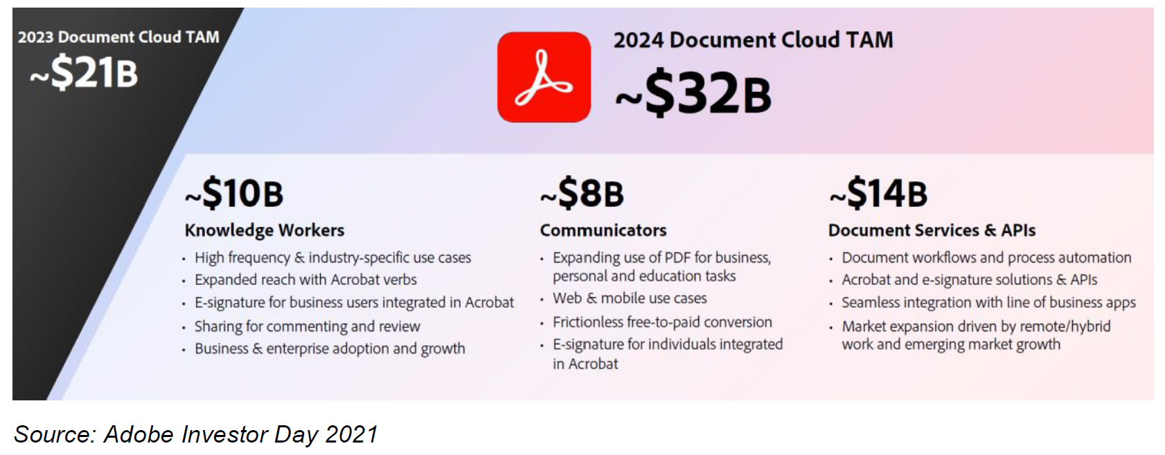 Document Cloud generated ~$2 Bn revenue in 2021 which contributed ~17% of total Digital Media and ~13% of Adobe’s total revenue.