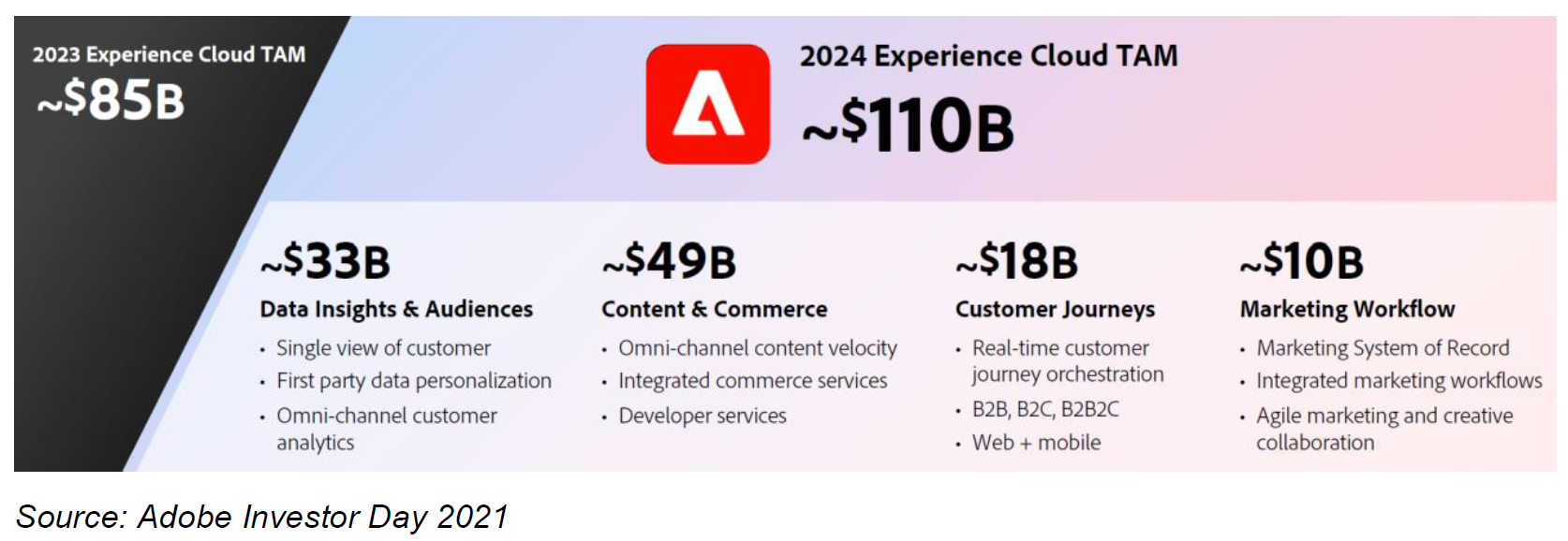 Digital Experience: Given the number of acquisitions Adobe made in this segment over the years, it is difficult to assess Adobe’s prior TAM estimates on Digital Experience. On the most recent investor day, Adobe estimated Experience Cloud’ TAM to increase from $85 Bn in 2023 to $110 Bn in 2024 which consists of Data Insights & Audiences ($33 Bn), Content & Commerce ($49 Bn), Customer Journeys ($18 Bn), and Marketing Workflow ($10 Bn).