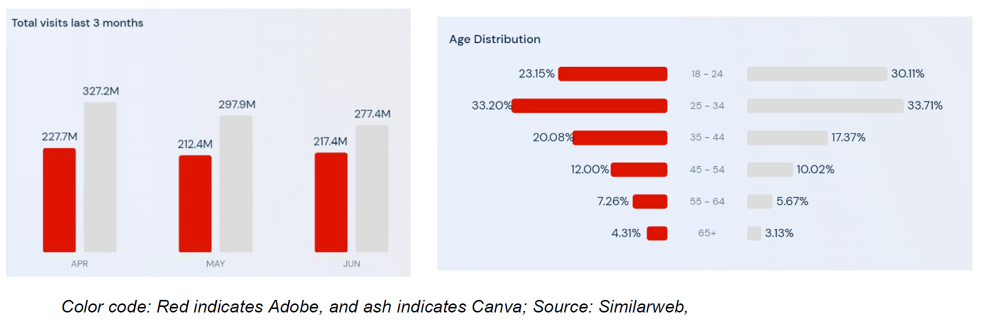 For context, Canva already receives higher traffic than Adobe. While the traffic is largely similar in the US, the traffic delta is significantly higher in the international market. Perhaps not surprisingly, younger people i.e. 18-24 year olds are some of the dominant users of Canva. And it’s not just all SEO game since as per Similarweb data, ~75% of the traffic to Canva is direct vs ~50% for Adobe.