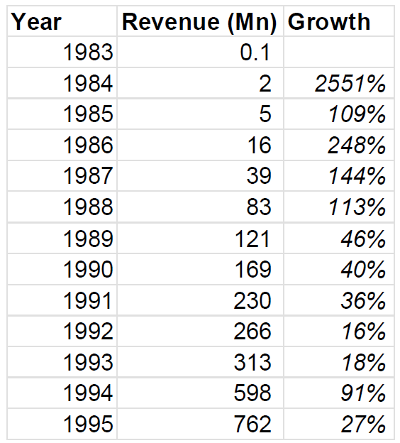 Chuck and John decided to leave their cushy jobs to start Adobe, which was named after a creek in Los Altos (near Chuck’s house). They developed PostScript, the device-independent programming language between PC and printer that could describe text, graphics, and images on one page. PostScript, along with the Apple Macintosh graphical user interface and laser printers, launched the desktop publishing industry in the 80s. Adobe found the product market fit right away and kept growing revenues at more than triple digit rates in the first six years since its founding. Apple (basically another Steve Jobs masterstroke) bought ~15% stake in Adobe in November 1984 for $2.5 Mn. Adobe went public in 1986, and when Apple decided to sell its stake in 1989 (alas, Jobs wasn’t there anymore), its stake was worth ~$84 Mn, a cool ~34x of its initial investment or ~102% CAGR over ~5 years. Apple, however, “missed out” on ~30% CAGR over almost four decades! I’m sure nobody is complaining at Apple, but why did Apple sell?