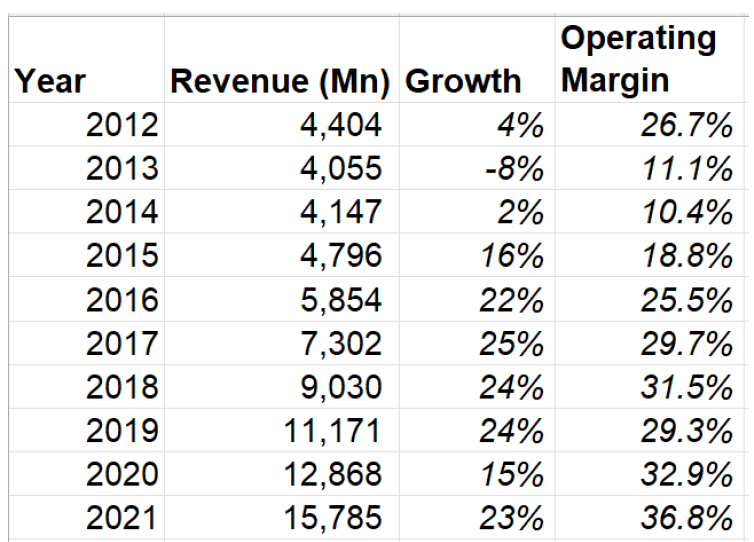 After being stuck at three million units under the perpetual licensing model, Adobe blew past its guidance of 4 million subscribers for 2015. Adobe exited 2015 fiscal year with more than 6 million subscribers. In my estimates, Adobe had more than 24 million subscribers to its Digital Media business (which is mostly Creative Cloud) in 2021, implying they indeed served just a fraction of the market under their old business model. Moreover, even though operating margin took an immediate hit following the switch to subscription as it went down from ~27% in 2012 to ~10% in 2014, it quickly recovered to ~26% in 2016, and in 2021, the operating margin (remember, this is GAAP, so I’m not ignoring SBC here) reached an envious 37%.
