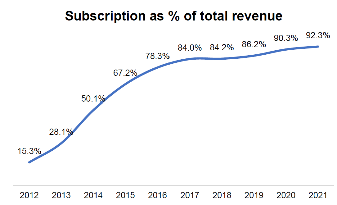 The vast majority of Adobe’s current revenue comes from subscriptions. While subscription as % of total revenue was only 15% in 2012, it was 84% of total revenue in 2017 and it gradually kept increasing in the revenue mix to reach 92% in 2021.