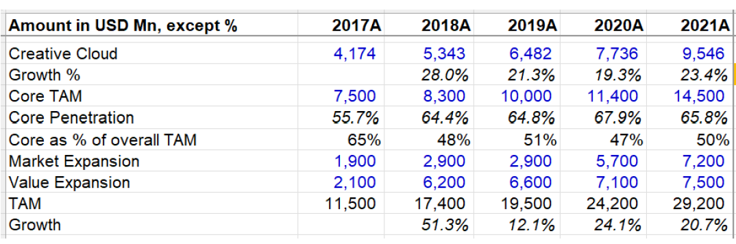 Creative Cloud: Up until November 2019 Analyst Day, Adobe used to breakdown the overall Creative Cloud TAM in three sub-categories: Core, Market Expansion, and Value Expansion. Core TAM is driven by growth of creative professionals, conversion from piracy, migration from perpetual licensing to subscription, free-to-paid conversion, SMB/enterprise seat expansion etc. Market expansion happened via broader interest among consumers on creativity tools, thanks to the rise of social media as well as the introduction of next generation apps such as Adobe XD, Adobe Express (formerly known as Spark), Adobe Scan etc. Finally, Value expansion happened by document cloud related services being integrated with creative cloud such as Adobe Sign.