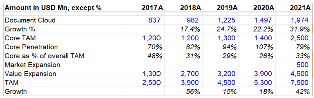Document Cloud: Just as for Creative Cloud, Adobe used to report its estimates for Document Cloud in three sub-categories: core, market expansion, and value expansion. Core TAM has been driven by the growth of PDF, conversion from piracy, migration to subscription, conversion from free-to-paid, the rise of digital document market, knowledge worker expansion, international growth etc. Value Expansion is largely driven by the migration from paper to digital e-signatures, and document intelligence services such as Form fill and sign, document protection etc. Adobe Scan and Adobe Sign boosted the “Market Expansion”. Using similar method that we used for Creative Cloud i.e. assuming the whole Document Cloud revenue assigned to Core TAM, we can see core penetration increased from ~70% in 2017 to ~80% in 2021. The fact that it was even 107% in 2020 clearly indicates the flawed nature of our assumption here. At least for Document Cloud, Market and Value expansions are pretty real and much clearer revenue opportunities than perhaps Creative Cloud is. Thanks to the pandemic, e-Signature has certainly become a powerful secular theme and Adobe’s increasing focus on that theme indicates material market opportunity for them in this segment.