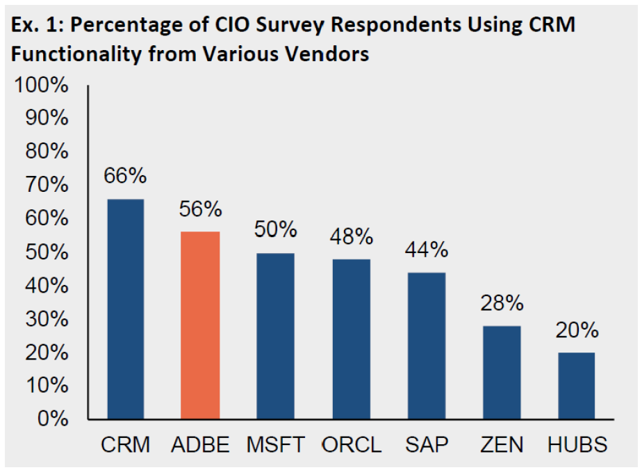 However, when I spoke with a few investors, my sense is that Digital Experience is oligopolistic and while Salesforce and Adobe are competitors in this segment, they are also often used simultaneously in an organization. For example, Wolfe Research did a survey among CIOs in April 2021 in which 66% of CIOs mentioned their companies use CRM from Salesforce whereas 56% mentioned Adobe, followed by 50% for Microsoft and 48% for Oracle. Such data point is evidence that multiple winners may be able to co-exist in this industry.