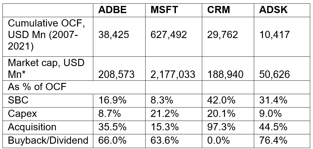 Let’s start with capital allocation. Since Shantanu Narayen became CEO in 2007, I wanted to look at Adobe’s capital allocation history during his entire period. Considering the length of his tenure, it would give me a better sense of how Adobe likes to allocate capital over the course of the whole economic cycle. For reference, I have also shown some peer enterprise software companies who have been around for multiple decades: Microsoft (MSFT), Salesforce (CRM), and Autodesk (ADSK). Adobe generated a cumulative $38 Bn Operating Cash Flow (OCF) from 2007-2021, ~9% of which was spent in Capex, ~36% was in acquisition, and ~66% was spent in buyback or dividends. Please note that Stock Based Compensation (SBC) accounted for ~17% of the OCF.