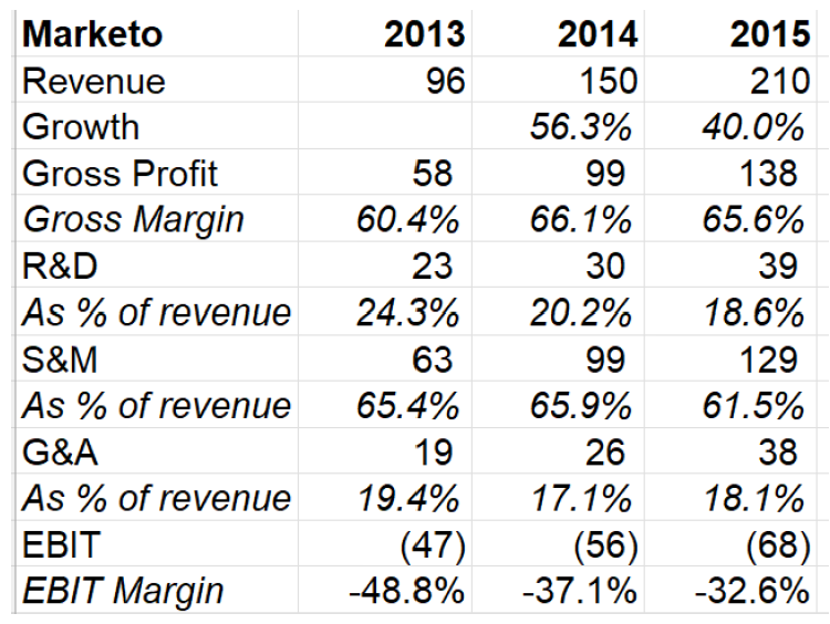 Marketo: Since Marketo went public in 2013, we have their financial statements till 2015 before Vista bought them for $1.8 Bn in 2016. Marketo’s top line grew by 40% in 2015; however, its operating margin was -33%. While operating margin markedly improved from -49% in 2013 to -33% in 2015, it was clearly far from ideal, and Vista perhaps wanted to streamline the operations to right size the cost structure a bit.