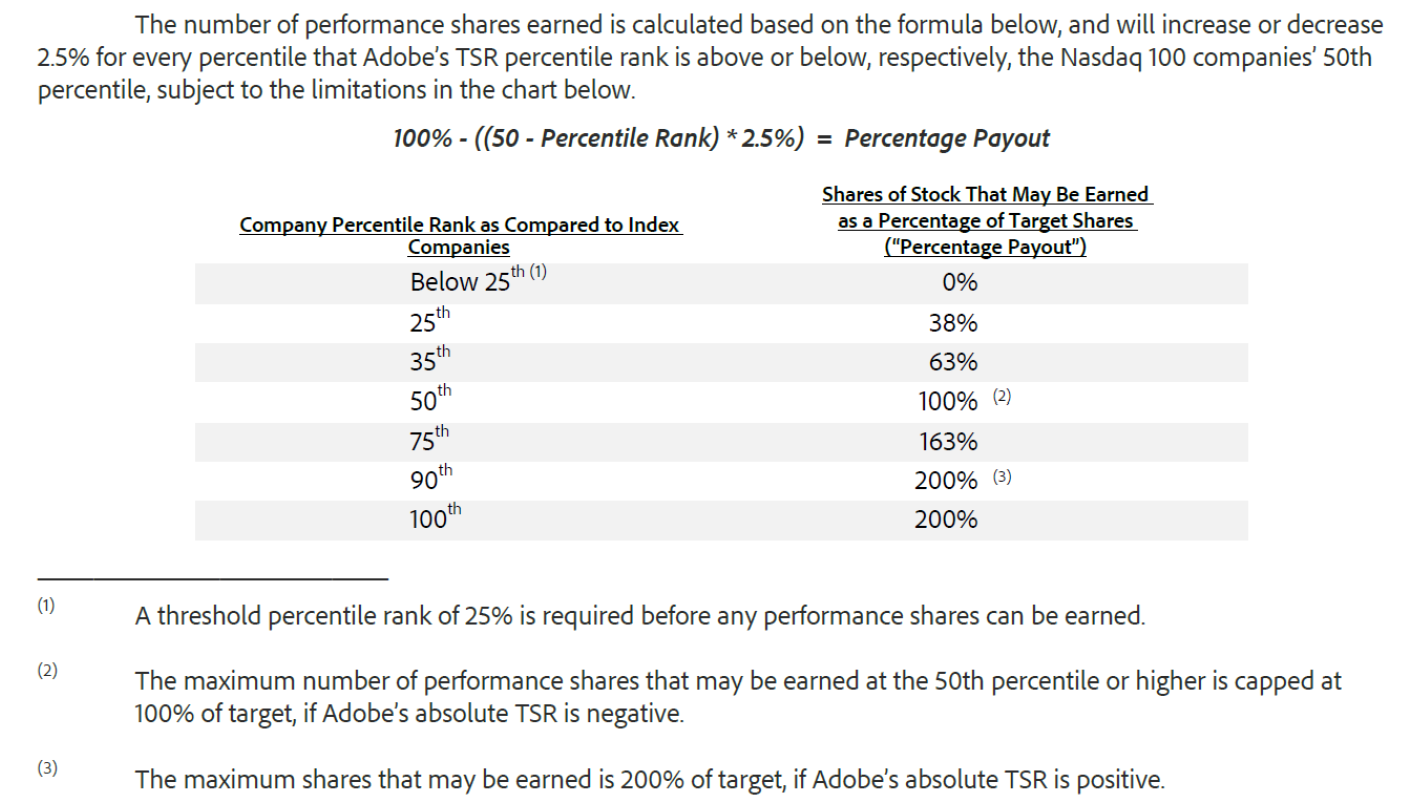 For long-term incentives, like Danaher, Adobe also follows a relative Total Shareholder Return (TSR) approach. While Danaher’s benchmark is S&P 500, Adobe’s benchmark is understandably NASDAQ 100. Again, similar to Danaher, if TSR is negative, the maximum payout is 100% even if relative TSR percentile is above 50 percentiles.
