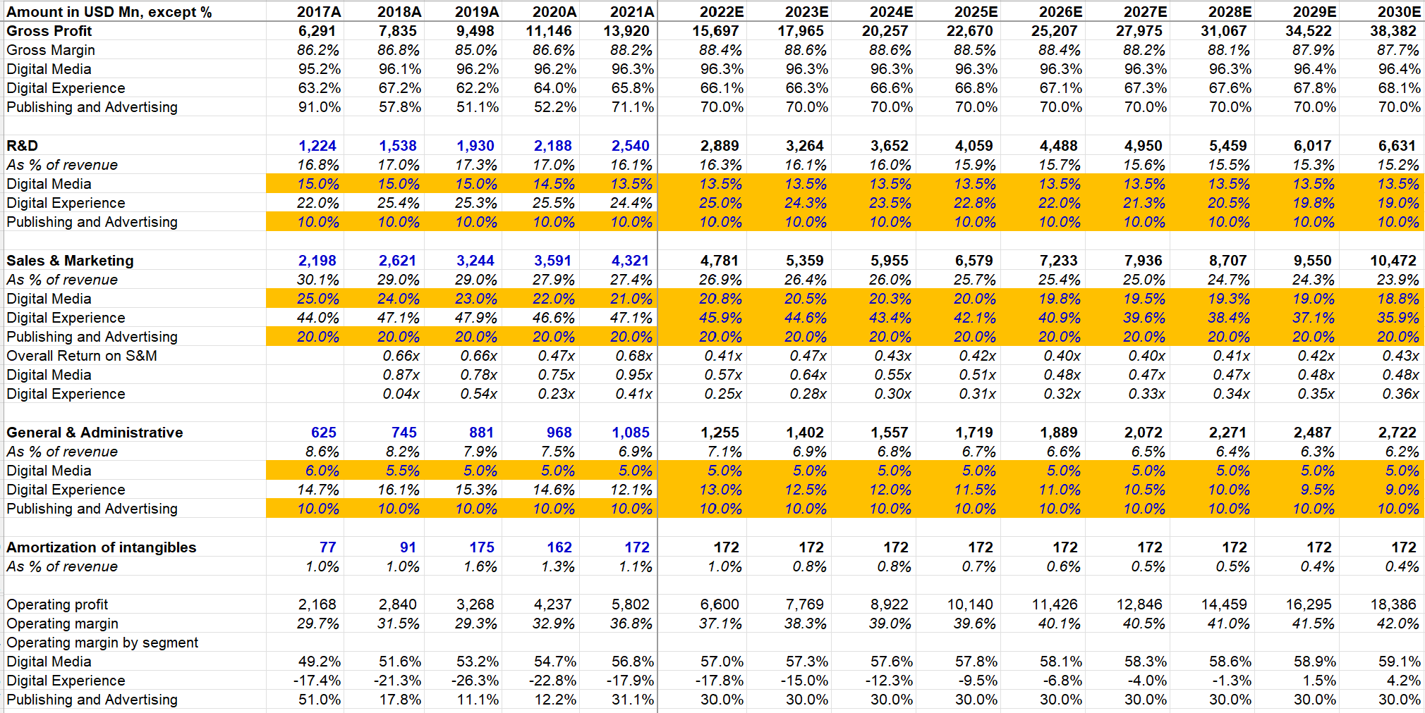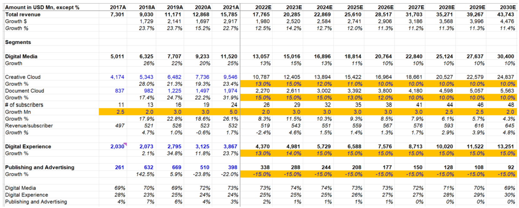 As explained before, Digital media has two sub-categories: Creative Cloud, and Document Cloud. My model implies Digital Media subscriber will increase from 24 mn estimated subscribers in 2021 to 48 mn in 2030. While the assumed pace of growth in percentage is lot slower compared to the past (i.e. estimated number of Digital Media subscribers increased from 11 mn in 2017 to 24 mn in 2021), the absolute number of new subscribers in the next 9 years is almost double the subscribers added in the last 4 years. This is probably indeed a good base case although I suspect the probability of posting 5-10 mn more subscribers in 2030 than assumed is lower than the probability posting 5-10 mn fewer subscribers. As I have discussed before, one potential lever to continue to post double digit or mid-teen revenue CAGR in Digital Media for this decade could be price increases. My model does imply revenue per estimated Digital Media subscriber to increase from $532 in 2021 to $645 in 2030. Price increases may come from a combination of adding new apps to Creative Cloud subscription as well as pure exercise of market power. Given the installed base, adding new apps and using that as “excuse” to increase price for Creative Cloud can allow Adobe to continue to post healthy topline growth even if subscriber numbers seem to hit a wall at some point. As you can imagine, maintaining the “monopoly” status is going to be key to be able to exercise such pricing power. Moreover, while I don’t expect Adobe to experience as much revenue volatility as it did in earlier recessions because of the earlier perpetual licensing model, there should be some impact in Adobe’s revenue during economic recession. Adobe may not be nearly as cyclical as advertising industry, but if your customers face the brunt of recession and stop hiring people, Adobe will in turn face similar headwinds. I don’t think my model captures such potential recessionary periods in the projection period.