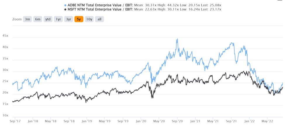 One thing that I noticed is Adobe has consistently traded at a premium to Microsoft in the last 5 years. The premium was really wide in 2020 and 2021 (EV/EBIT multiple of ~25x for MSFT vs ~40x for ADBE), but it has recently come down to trade much more closely with each other even though ADBE still trades at a slight premium. While ADBE’s EBIT grew at 31.2% CAGR over the last 5 years, MSFT’s EBIT grew at 25.1% CAGR. So, the premium is not without justification. But looking at the competitive dynamics, durability, and strength of ADBE’s vs MSFT’s moats, I would be far less enthusiastic to pay any premium for ADBE compared to MSFT.