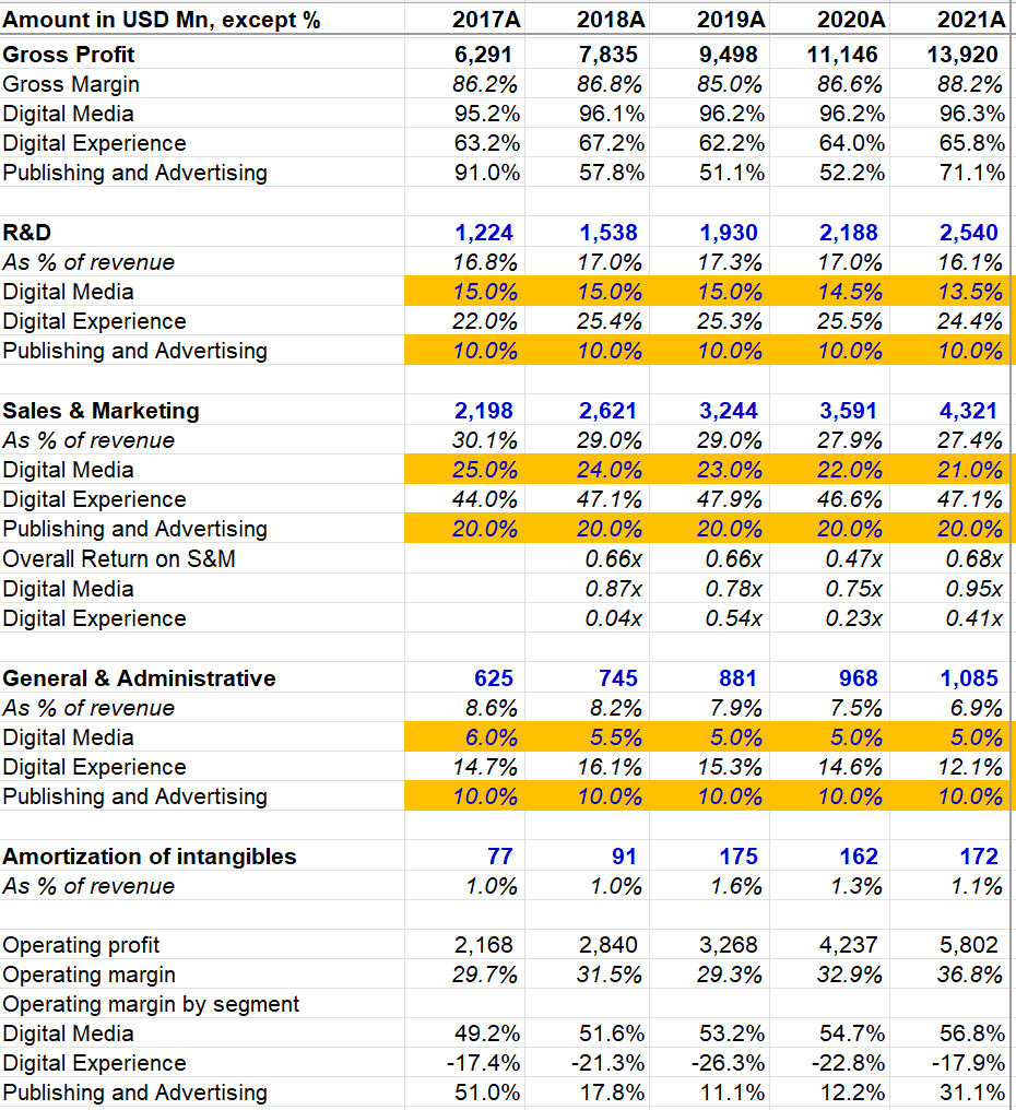 The rest of the cost structure is a little tricky, but I made an attempt to segregate the margin of Digital Media and Digital Experience. Again, readers should remember that these are my estimates and actual numbers may differ from my estimates.