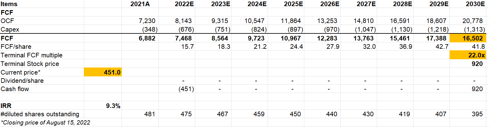 If you are reading my deep dive for the first time, I strongly encourage you to read my piece on “approach to valuation”. Please read it at least once so that you understand what I am trying to do here. I follow an “expectations investing” or reverse DCF approach as I try to figure out what I need to assume to generate a decent IRR from an investment which in this case is ~9%. Then I glance through the model and ask myself how comfortable I am with these assumptions. As always, I encourage you to download the model and build your own narrative and forecast as you see fit to come to your own conclusion. None of us have the crystal ball to forecast 5-10 years down the line, but it’s always helpful to figure out what we need to assume to generate a decent return.