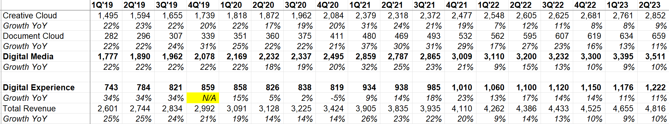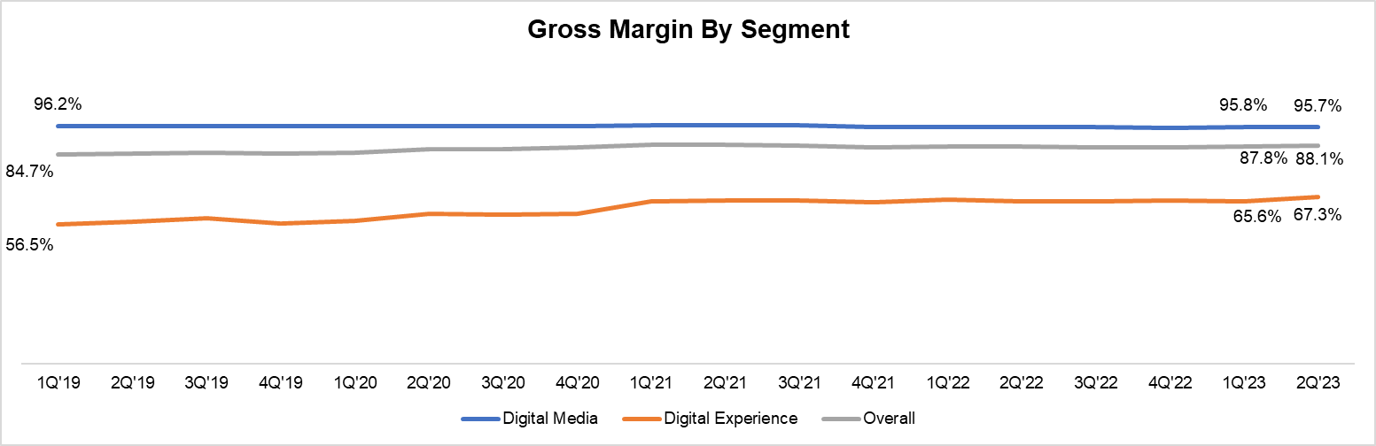 Digital Media gross margin remains steady at ~96%, but Digital Experience posted its highest ever gross margin of 67.3% in 2Q'23. Overall gross margin expanded by 41 bps YoY to 88.1% last quarter.