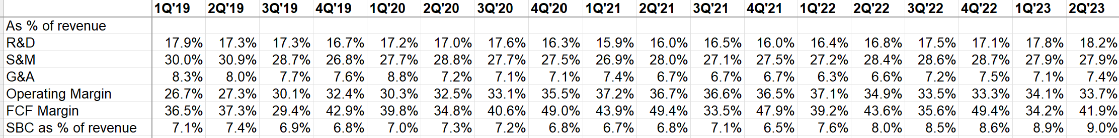 2Q'23 GAAP operating margin was 33.7%, down from 34.9% in 2Q'22. SBC as % of revenue increased from 8.0% in 2Q'22 to 9.0% in 2Q'23. Working capital benefits and SBC make FCF look better than it is.