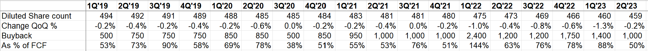 Buyback pace has slowed down as Adobe only utilized 50% of their FCF to buyback shares which is noticeably lower compared to the last three quarters. Share count went down by only 0.2% QoQ.