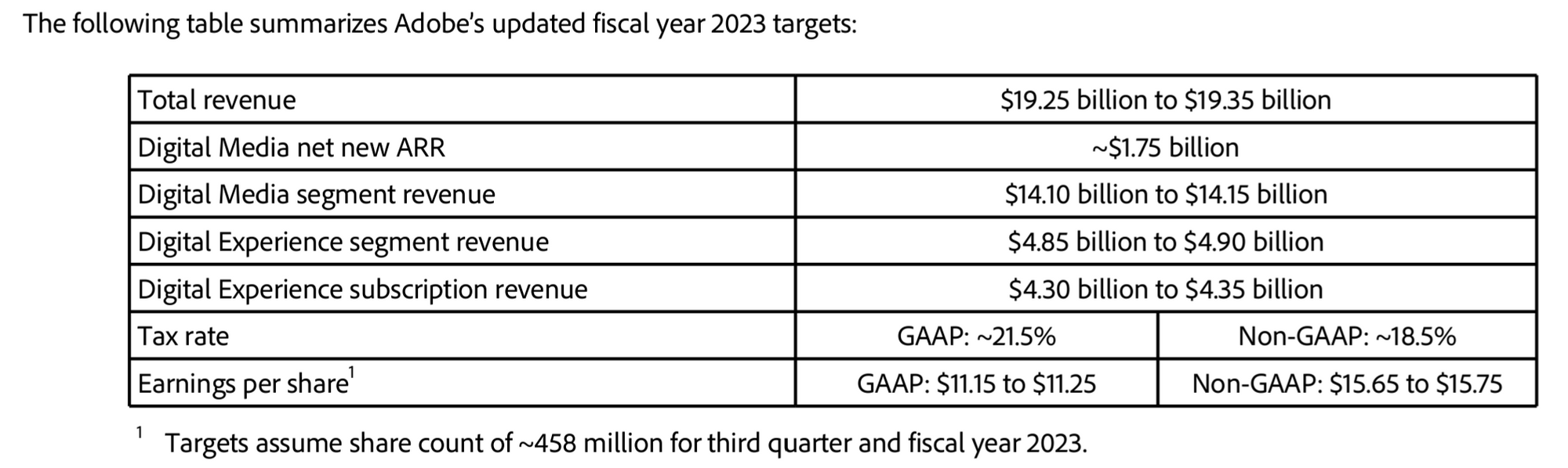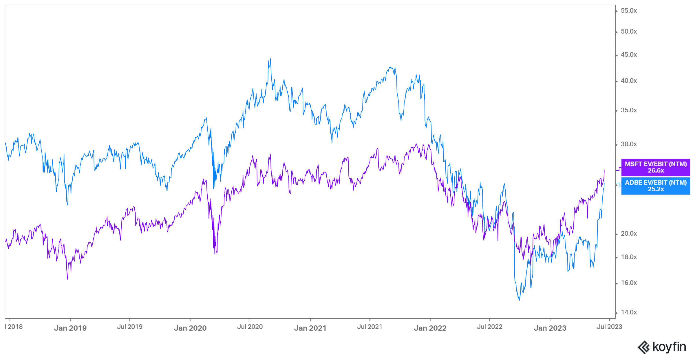 Analysts estimate Adobe's NTM EBIT (non-GAAP) to be $8.7 Bn. Adobe's 1H'23 SBC was $849 Mn (vs $674 Mn in 1H'22). Let's double the 1H'23 number to assume NTM SBC to be $1.7 Bn which would make NTM GAAP EBIT to be $7 Bn. After making the numbers more apple-to-apple, Adobe actually currently trades at ~31x NTM EV/EBIT multiple (ignoring AH rally), almost ~5 turn higher than Microsoft. Even if these estimates are revised upwards a little, the multiple isn't going to change much.