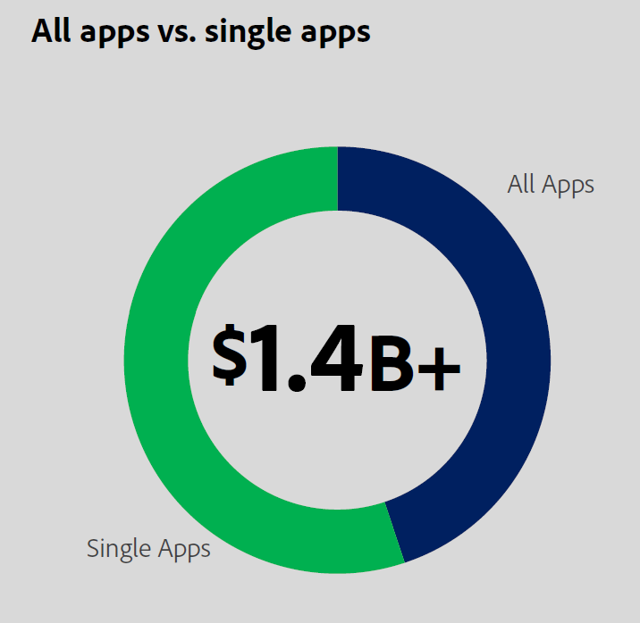 Take the below graph for example which Adobe shared on their last Analyst Day. Majority of their net new ARR in Creative Cloud comes from single apps, a likely material percentage of which I assume come from consumer+ SMB segment. If AI is truly as revolutionary tech as the consensus thinks it to be, I wonder if Google and Meta will make Adobe's life difficult in the consumer+ SMB segment. Given the pace at which Meta, Google, or Microsoft (thanks to OpenAI) are moving in AI, it would not shock me if they completely end up disrupting consumer creativity software industry. Kevin Kwok wrote in his piece tiled "How to Eat an Elephant, One Atomic Concept at a Time":