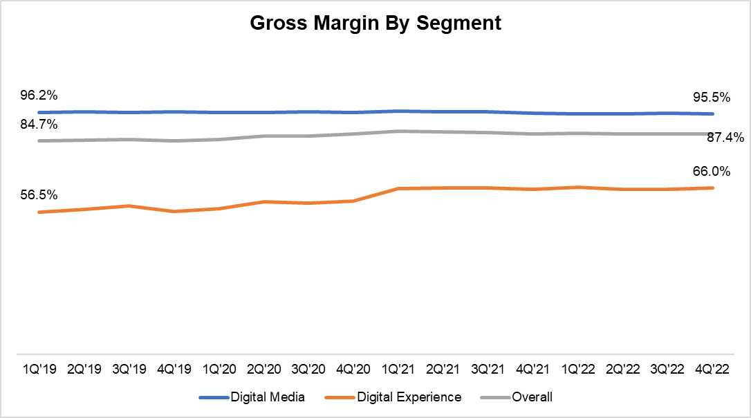 I'm not sure I have ever seen any company reporting 96% gross margin before, but Digital Media's gross margin remains steady at ~95-96% despite the FX headwind. Digital Experience's gross margin increased by 55 bps YoY to 66.0%, and overall company's gross margin was 87.4% last quarter.