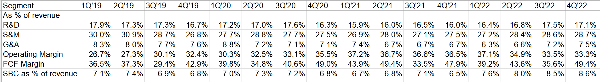 Thanks to net working capital benefit and SBC, FCF is consistently materially higher than operating margin. There's not much sign of SBC leverage, but as I explained here, you shouldn't expect SBC as % of revenue to go down anytime soon.