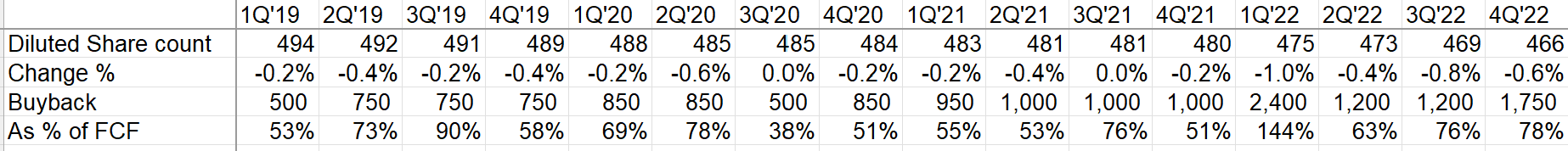 Adobe has ramped up its buyback activity this year, declining ~3% shares outstanding. ~89% of last year's FCF was used to repurchase its shares.