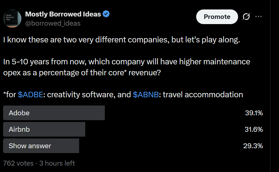 I posed a question to my X (formerly twitter) followers: In 5-10 years from now, which company will have higher maintenance opex as a percentage of their core revenue? Interestingly, more people thought it was Adobe which will have higher maintenance opex as percentage of their core revenue!