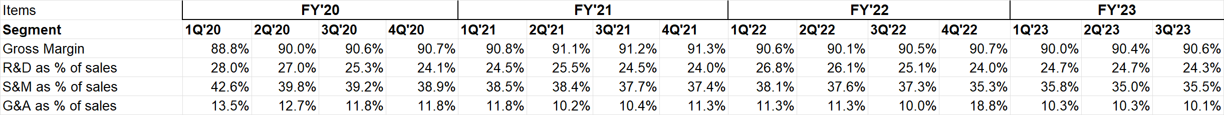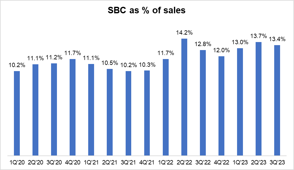 Although SBC has no sign of cost leverage, off the top of my head I cannot think of any tech company (at least the ones I studied) which experienced any SBC leverage over their cost base. From ~10-11% to ~12-13% of sales is perhaps nothing to be too critical about.