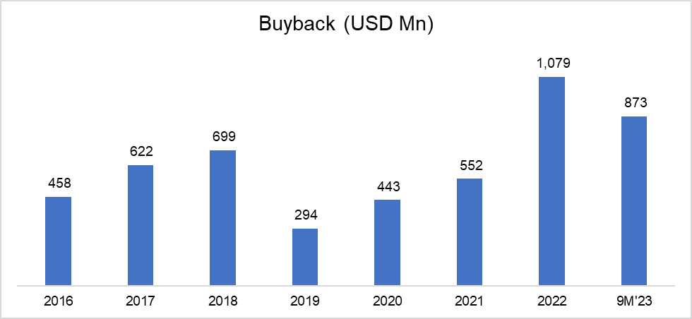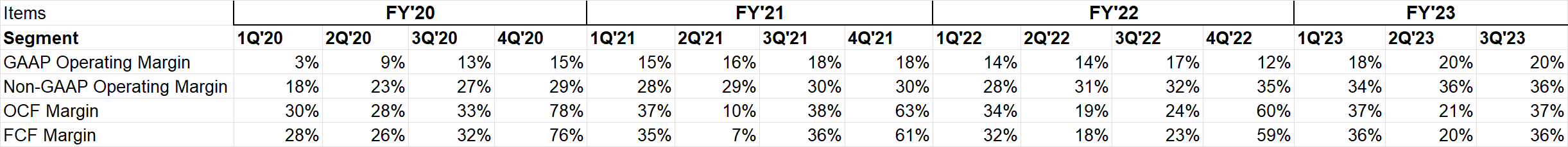 GAAP EBIT margin expanded from ~17% in 3Q'FY22 to ~20% in 3Q'FY23. Non-GAAP margin similarly expanded from ~32% to ~36% in the same time. Management reiterated non-GAAP margin guidance to ~38-40% sometime in FY'23-26 window.