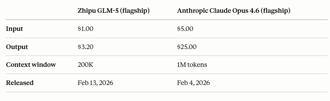 For context, here’s the head-to-head on Anthropic’s Claude Opus 4.6 and Zhipu’s GLM-5.1 flagship model API pricing (per million tokens):